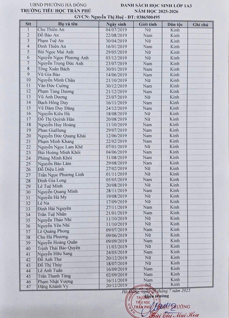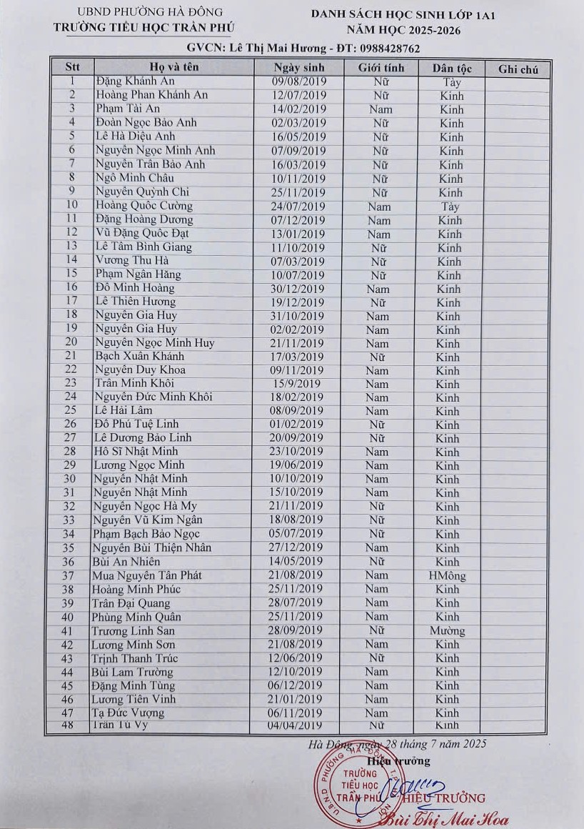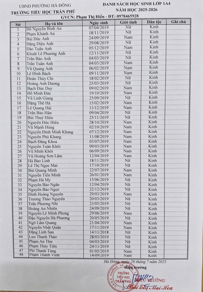 DANH SÁCH HỌC SINH LỚP 1 NĂM HỌC 2025-2026 CỦA TRƯỜNG TIỂU HỌC TRẦN PHÚ