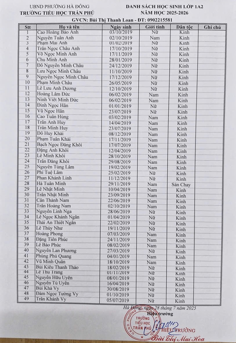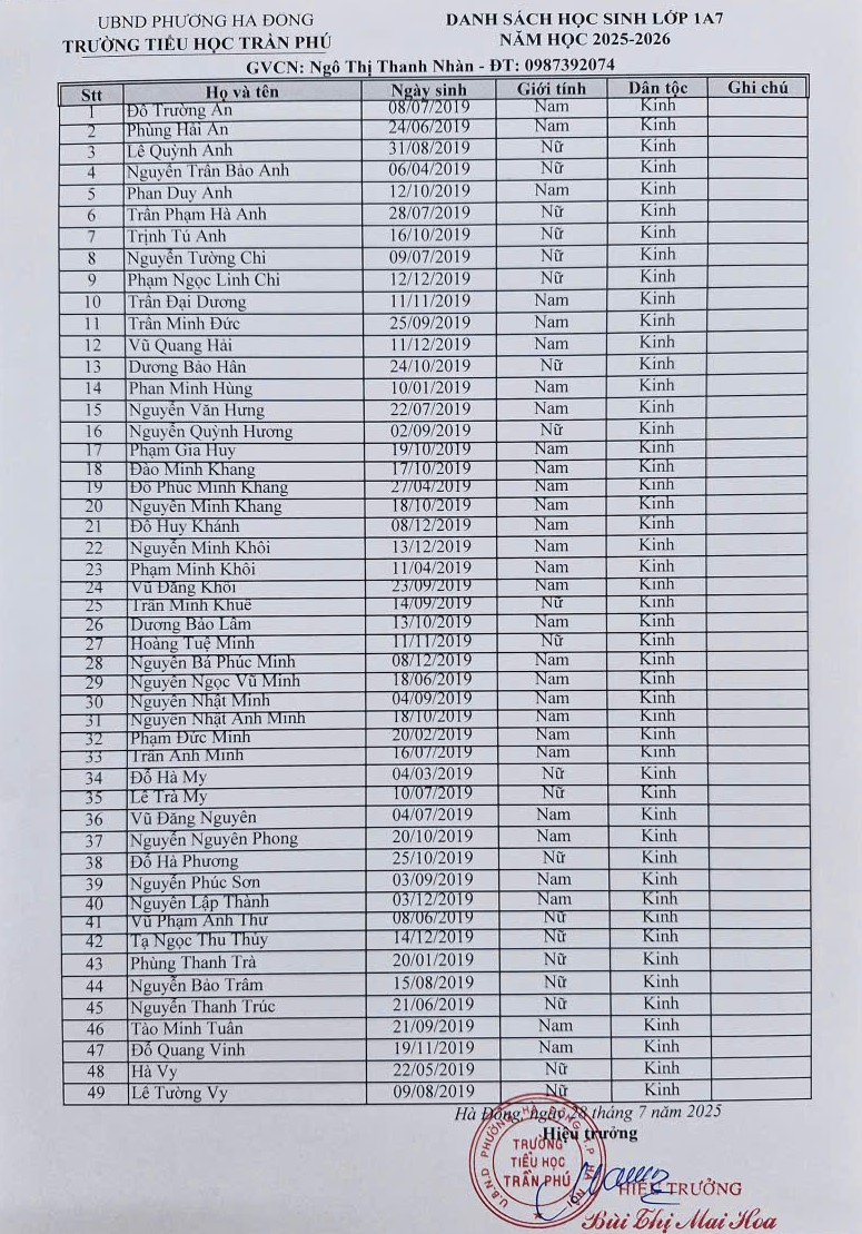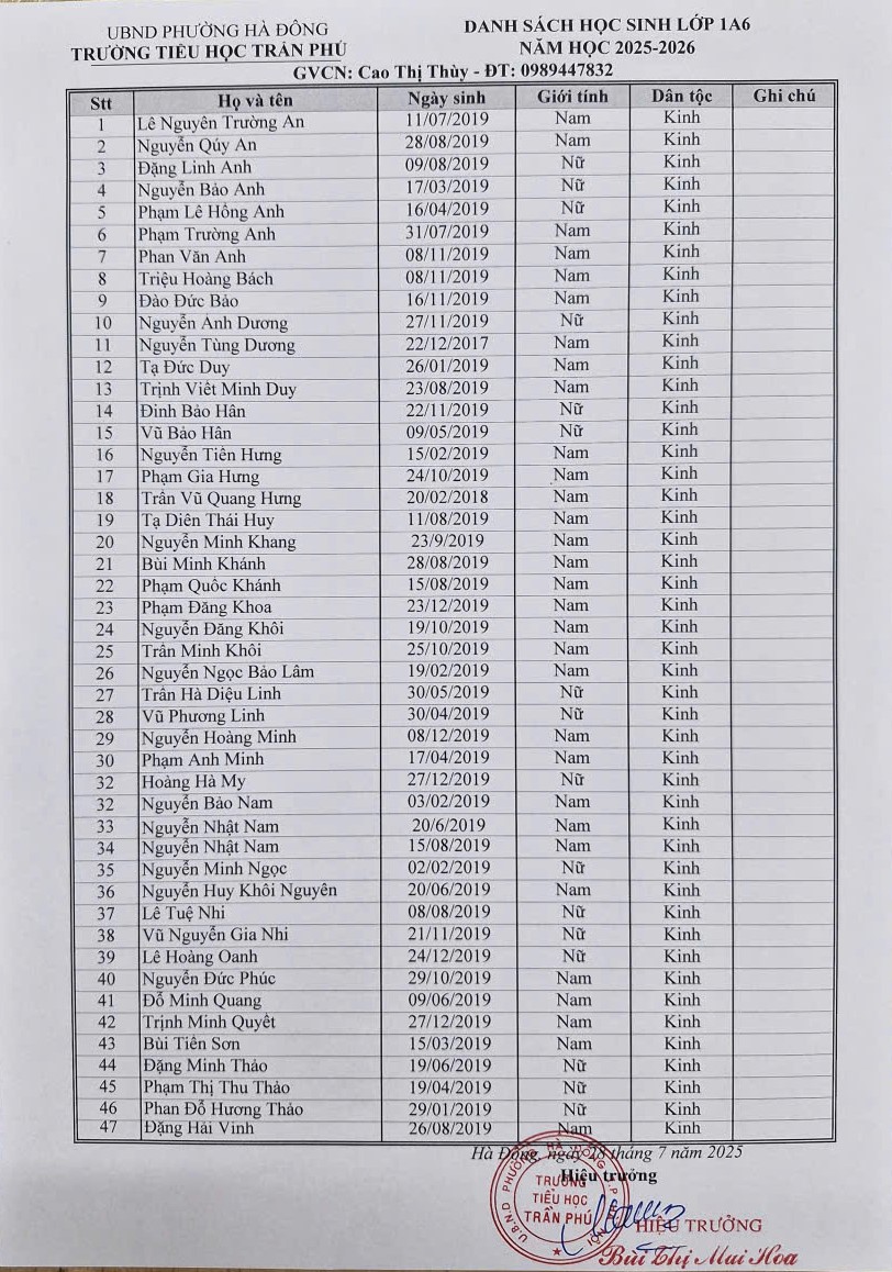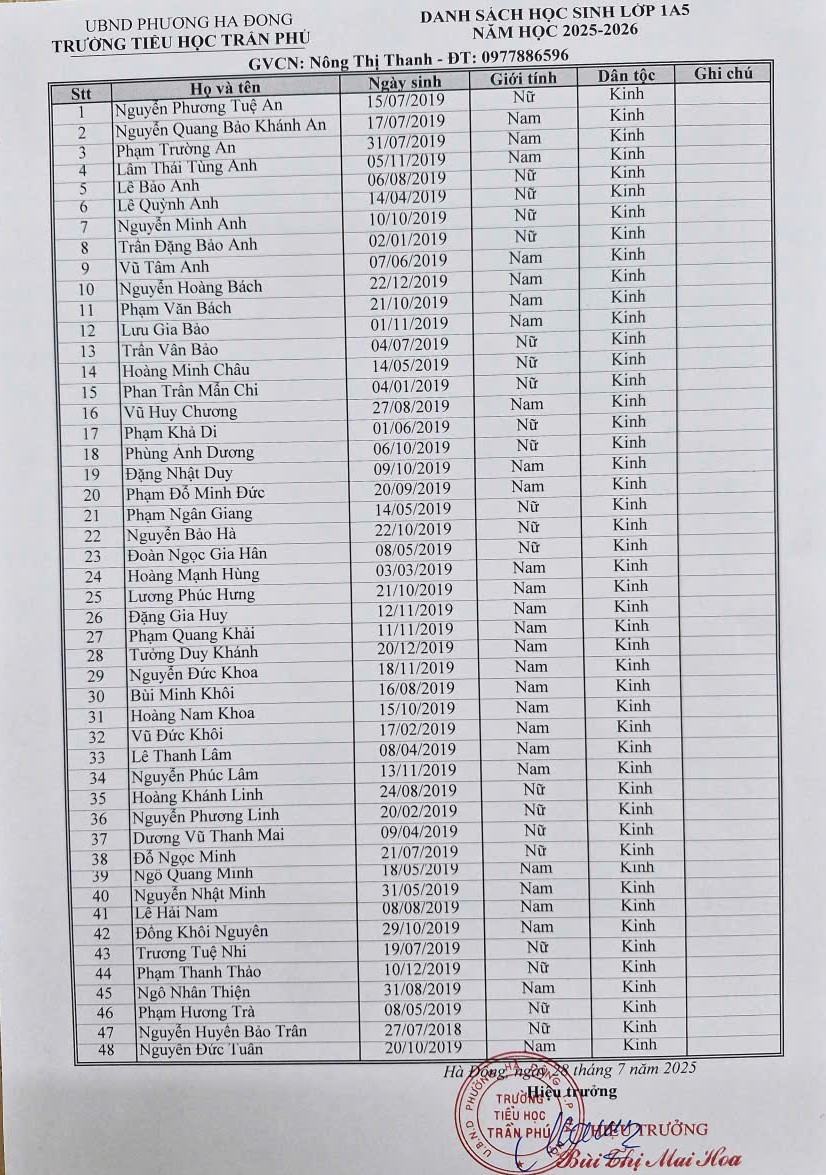 DANH SÁCH HỌC SINH LỚP 1 NĂM HỌC 2025-2026 CỦA TRƯỜNG TIỂU HỌC TRẦN PHÚ