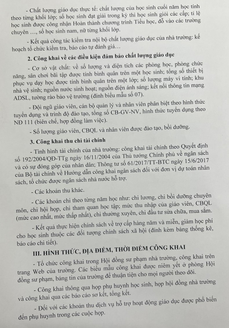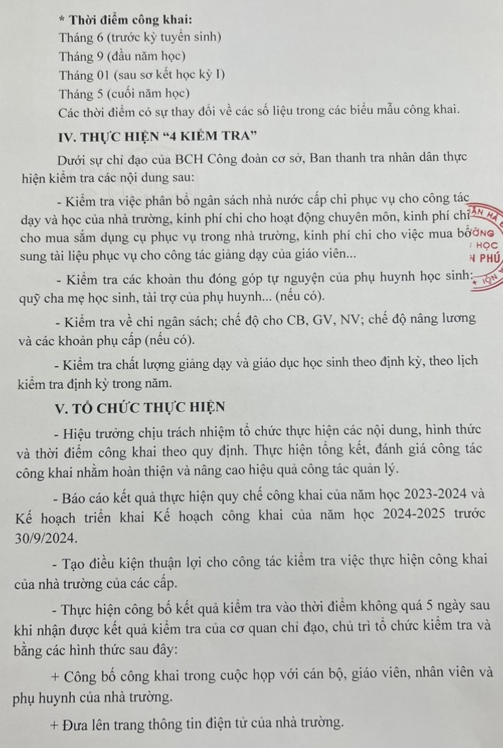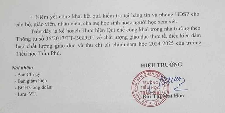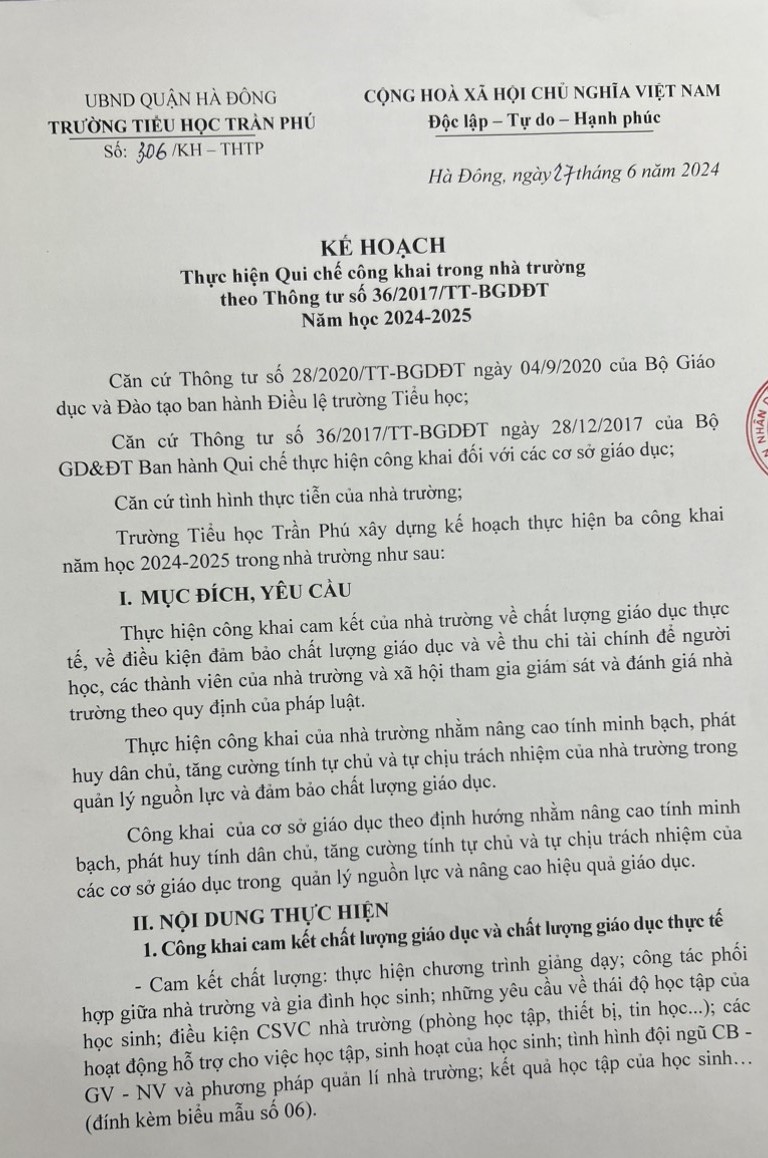 Ngày 27/6/2024 trường TH Trần Phú ra kế hoạch số 306/KH-THTP về thực hiện quy chế công khai trong nhà trường