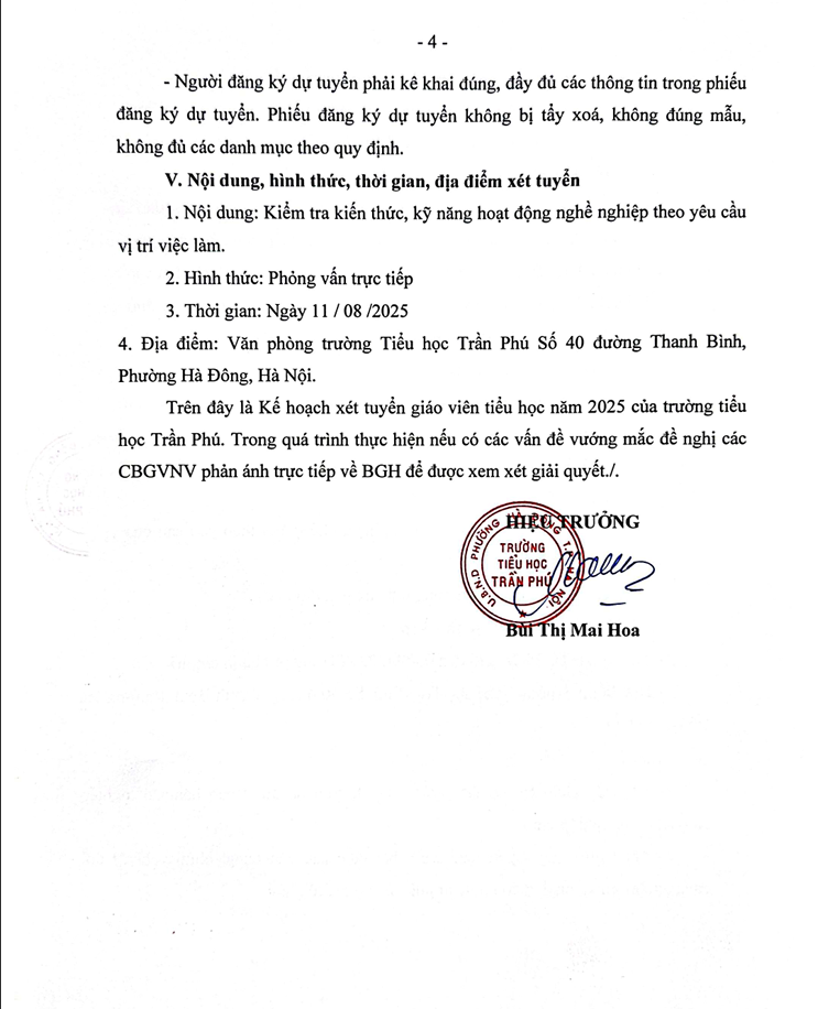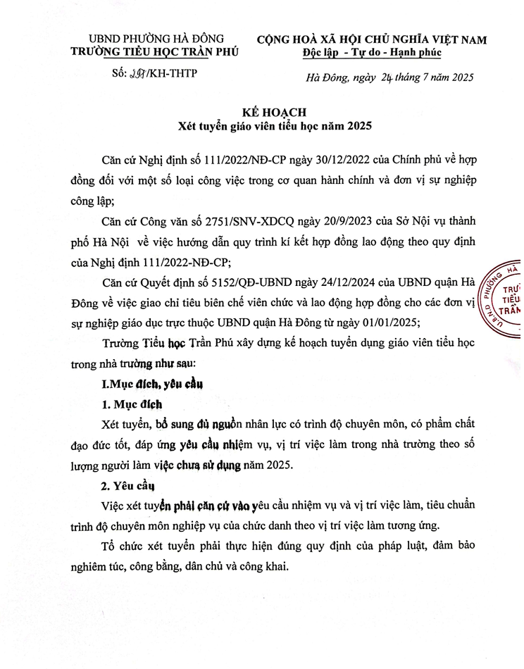 Kế hoạch số 297/KH-THTP ngày 24/7/2025 về xét tuyển giáo viên tiểu học năm 2025 và Thông báo số 298/TB-THTP ngày 24/7/2025 v/v tuyển dụng giáo viên hợp đồng của trường Tiểu học Trần Phú.