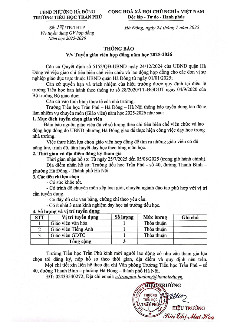 Kế hoạch và Thông báo về việc tuyển dụng giáo viên hợp đồng của trường Tiểu học Trần Phú năm học 2025-2026