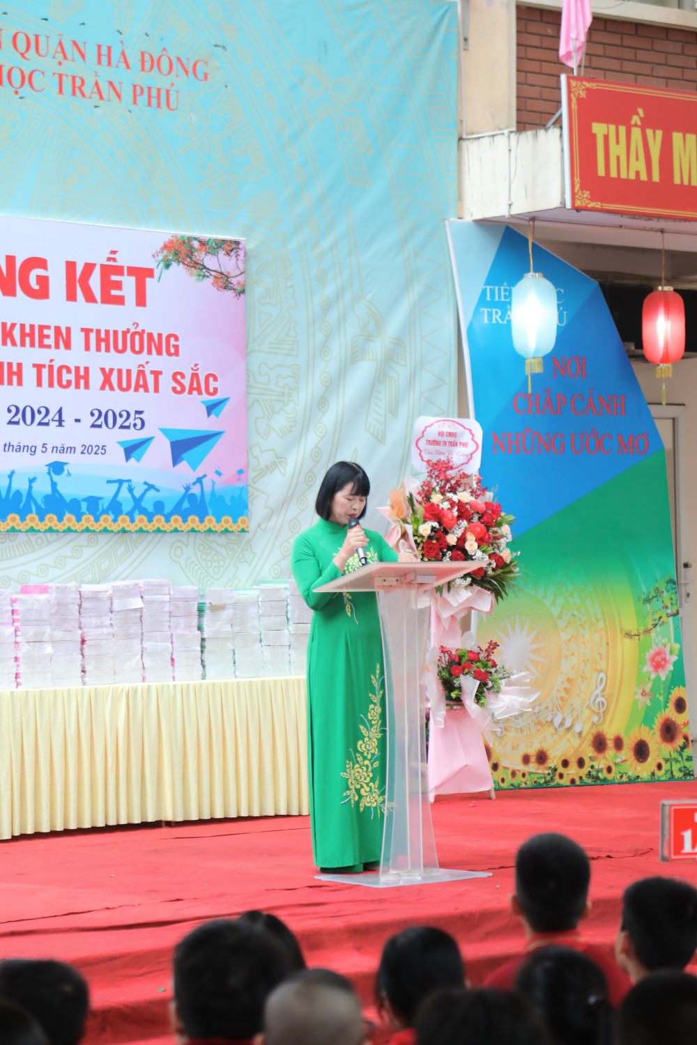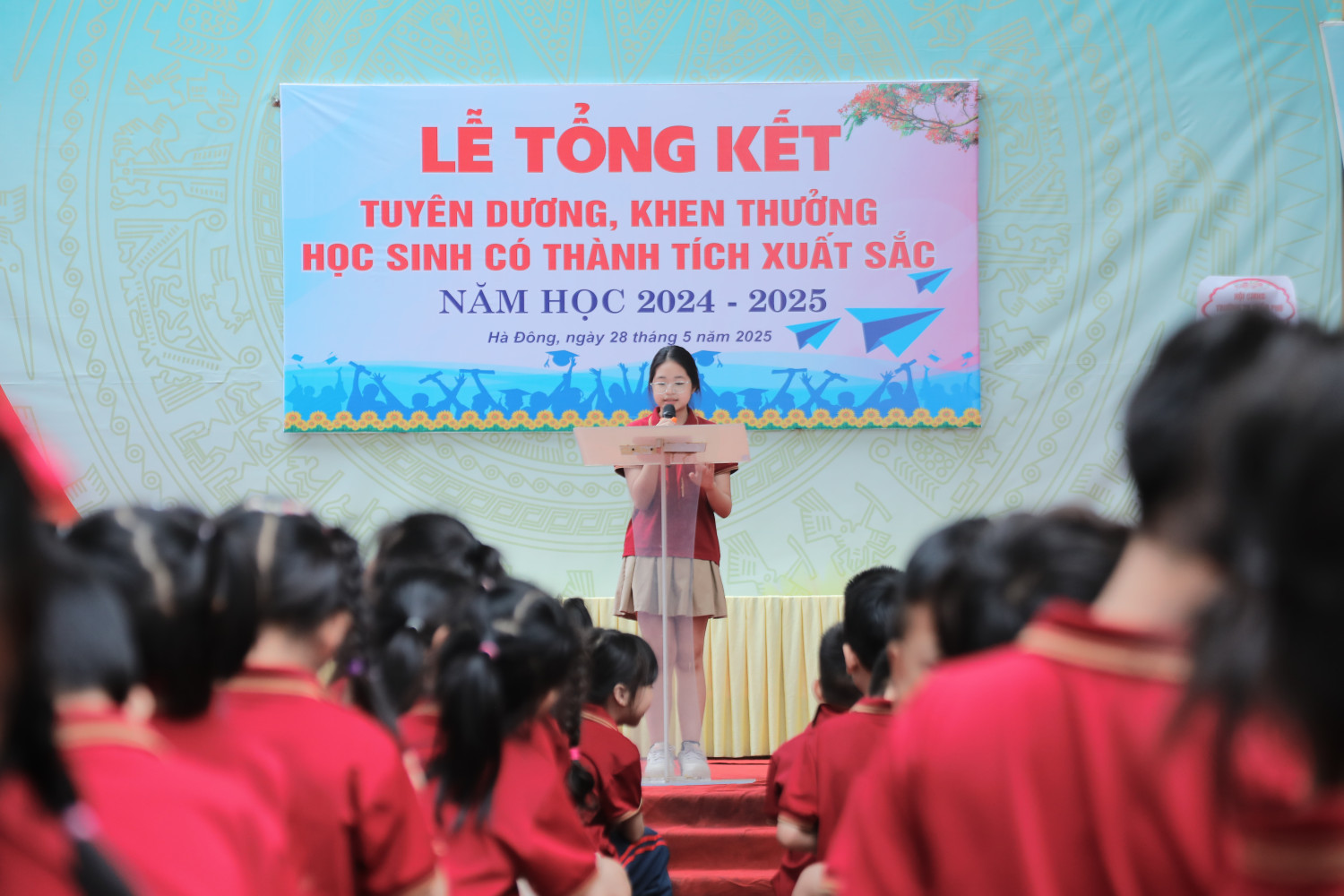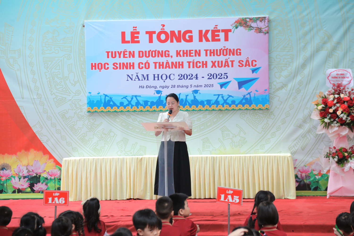 Tại buổi lễ, nhà trường đã tuyên dương và khen thưởng các tập thể lớp, học sinh xuất sắc, học sinh tiêu biểu vượt khó, giáo viên có thành tích nổi bật trong phong trào thi đua dạy tốt – học tốt như sau: * Đối với Cán bộ, giáo viên: - Thi Giáo viên dạy giỏi cấp trường: đạt 02 giải Nhất, 03 giải Nhì, 02 giải Ba, 03 giải KK. - Thi Giáo viên dạy giỏi cấp Quận: đạt 01 giải Nhất, 01 giải Nhì, 01 giải KK. - Thi TDTT cấp Quận (môn cầu lông): 02 giải Ba * Đối với học sinh: - Cấp Quốc tế: Thi Toán quốc tế Timo: đạt 02 Huy chương Bạc; 02 Huy chương Đồng. Thi Olympic Toán CMO: 01 Huy chương Vàng Thi Toán tài năng ITMG: 01 Huy chương Vàng Thi Toán Asmo: 01 huy chương Bạc, 01 giải KK Thi Toán-Tiếng Anh Asmo: 01 giải KK - Cấp Thành phố: Thi Trạng nguyên Tiếng Việt: 01 giải Nhất, 08 giải Nhì, 08 giải Ba, 04 giải KK Thi bơi ếch nữ: 01 Huy chương Vàng Thi Viết chữ đẹp do báo Thiếu niên tổ chức: đạt giải Khuyến khích - Cấp Quận: Thi bóng đá nam: đạt Huy chương Vàng Thi bóng rổ nam: đạt Huy chương Đồng Olympic Tiếng Anh: 03 giải Nhì; 9 giải Ba; 10 giải KK Thi Vioedu: đạt 04 giải Vàng; 08 giải Bạc; 08 giải Đồng và 34 giải KK. Thi Trạng nguyên Tiếng Việt: 4 Nhất; 27 Nhì; 32 Ba; 32 KK. - Cấp Trường: Thi Olympic Tiếng Anh: 9 giải Nhất, 12 giải Nhì, 20 giải Ba, 29 giải KK. Thi Viết chữ đẹp: 24 giải Nhất, 31 giải Nhì, 38 giải Ba, 33giải KK. Thi Vioedu: 22 Nhất – 23 Nhì – 29 Ba – 27 KK Thi Trạng nguyên Tiếng Việt: 15 Nhất; 21 Nhì; 29 Ba; 32 KK. Thi ngày hội “Thiếu nhi vui khỏe”: 5 giải Nhất, 10 giải Nhì, 22 giải Ba. Buổi lễ tổng kết không chỉ là dịp để ghi nhận những kết quả đạt được, mà còn là cơ hội để thầy và trò cùng nhìn lại chặng đường đã qua, khơi dậy niềm tự hào, động lực tiếp tục phấn đấu trong năm học mới.