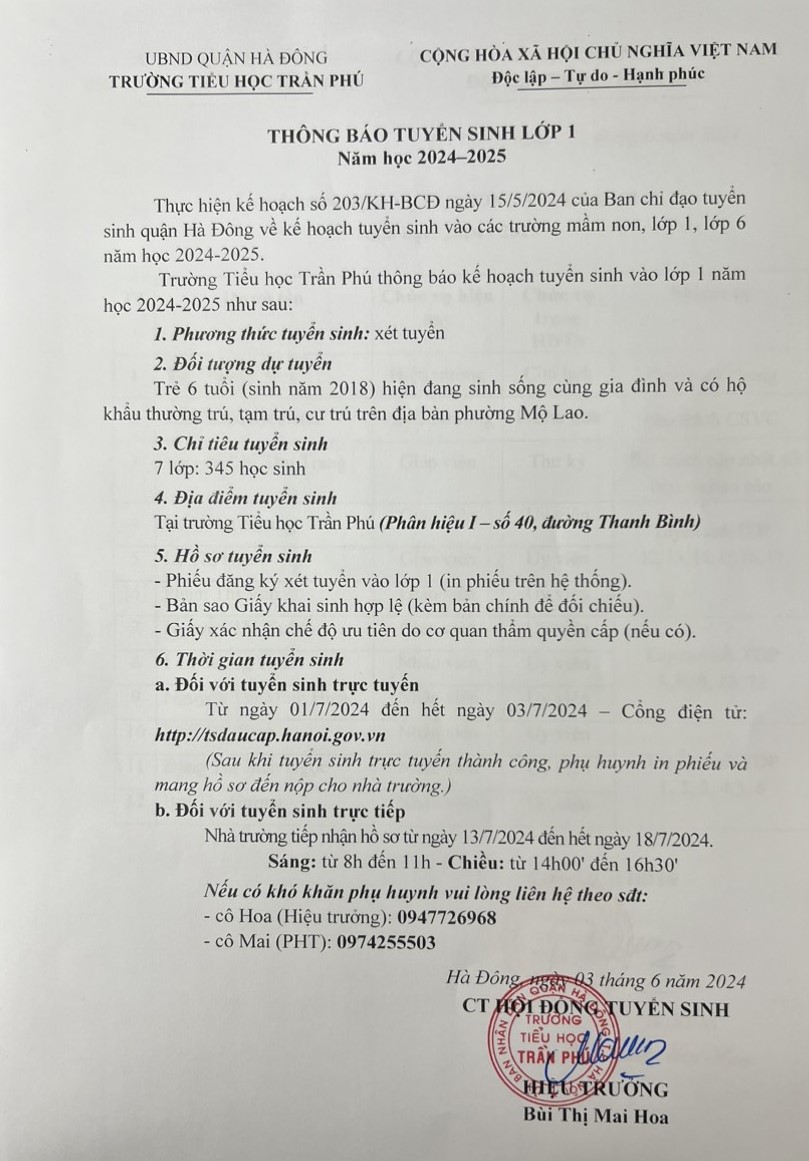 Thông báo tuyển sinh vào lớp 1 năm học 2024-2025 của trường tiểu học Trần Phú