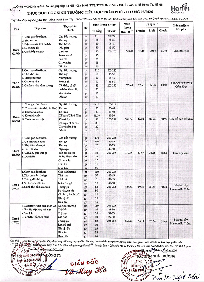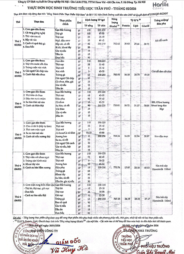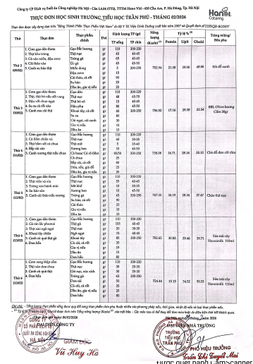 Thực đơn tháng 2/2026