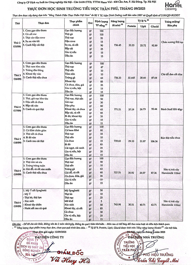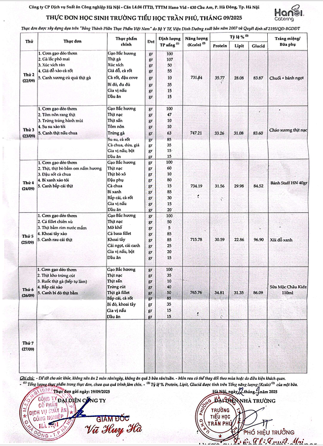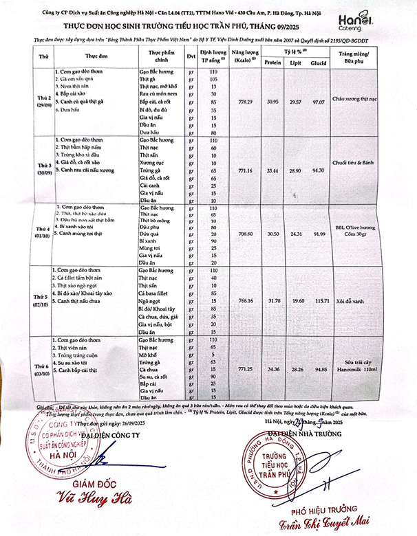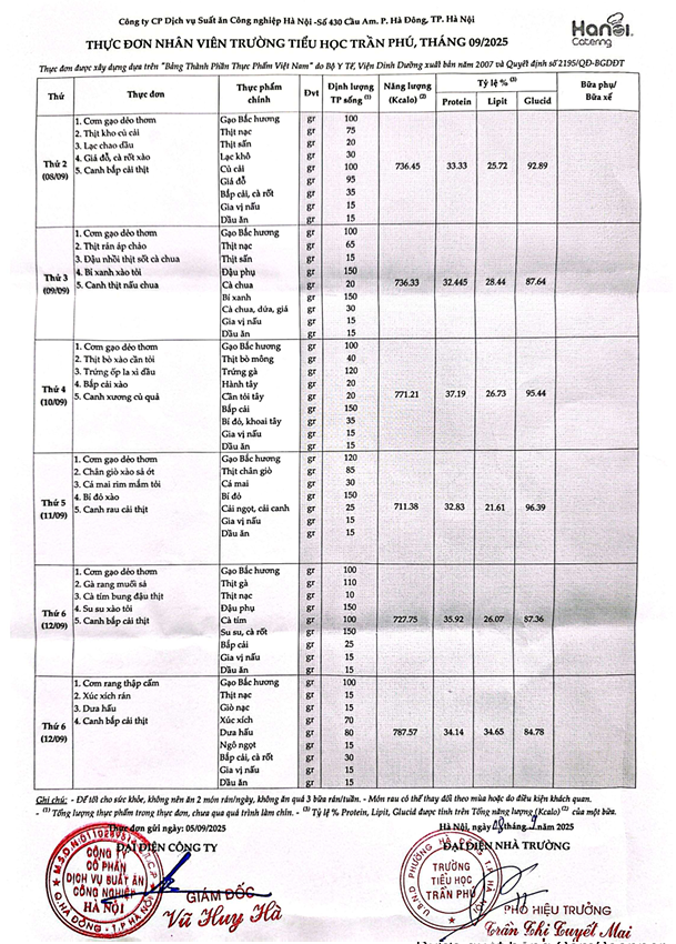 Thực đơn Tháng 9 trường Tiểu học Trần Phú - Phường Hà Đông