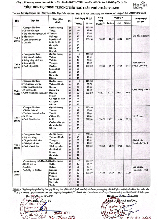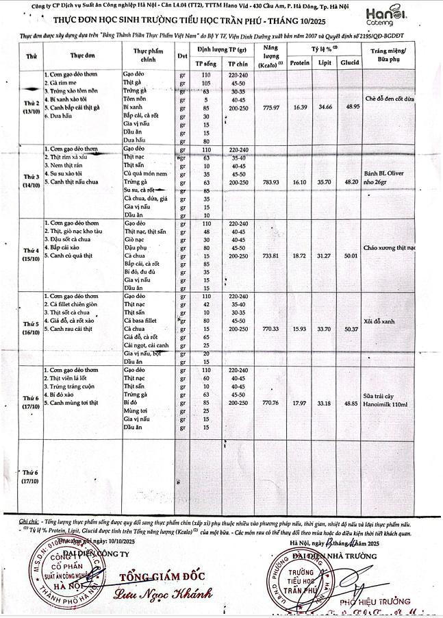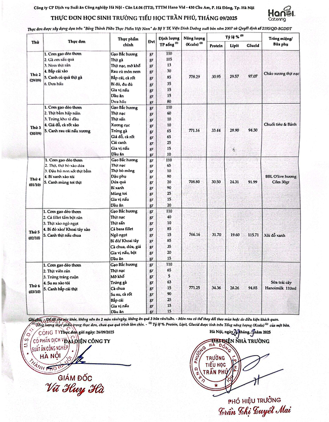 Thực đơn tháng 10 trường TH Trần Phú - P. Hà Đông.