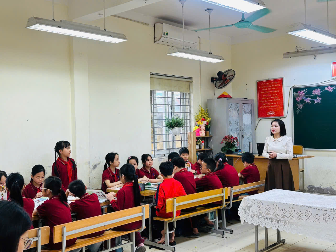 Trong tiết học, giáo viên đã vận dụng linh hoạt các phương pháp và hình thức tổ chức dạy học, học sinh được tìm hiểu kiến thức, thảo luận, hợp tác nhóm và thực hành tạo ra sản phẩm học tập từ những vật liệu quen thuộc, dưới sự hướng dẫn của giáo viên. Không khí lớp học diễn ra sôi nổi, tích cực, sáng tạo.
