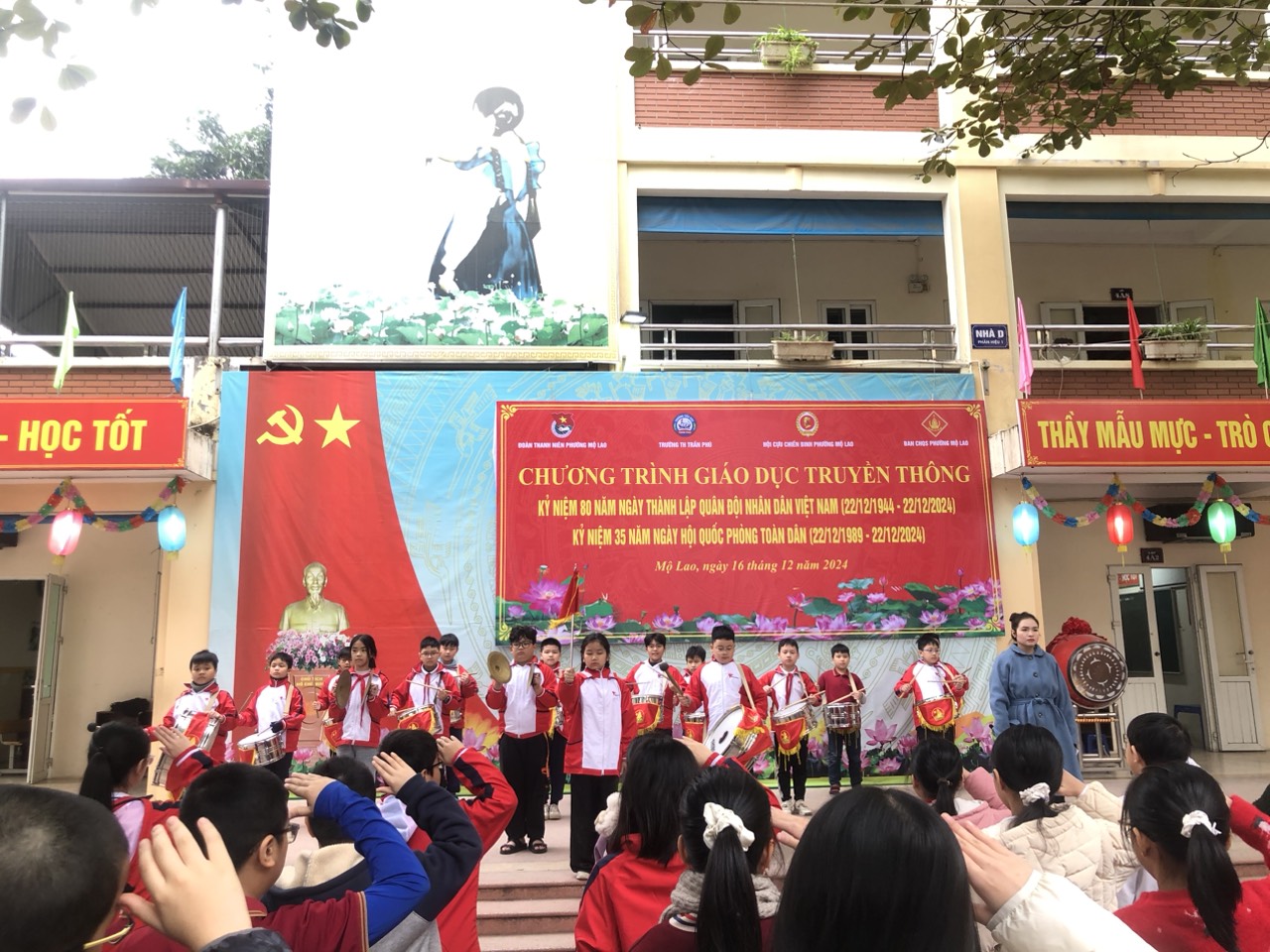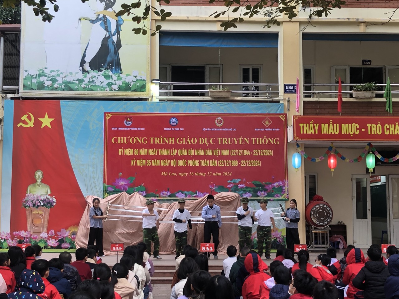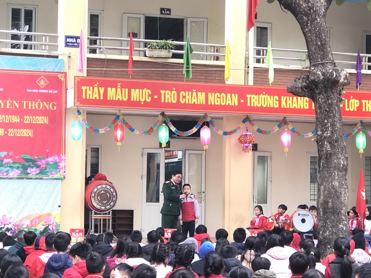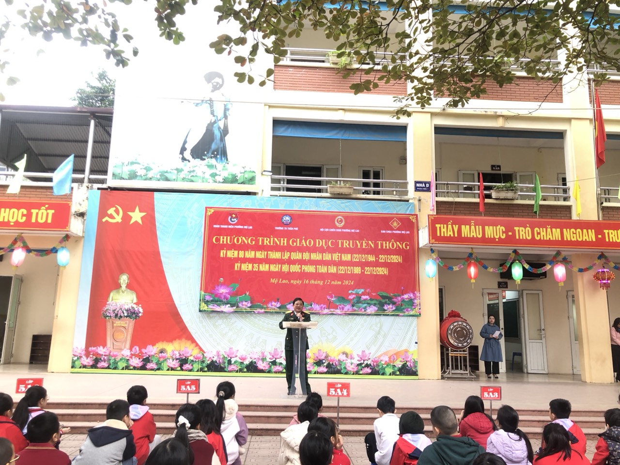 Tiếp theo là phát biểu của cô Hiệu trưởng, và đặc biệt bài phát biểu của Thượng tá Trần Hữu Nội - đại diện cho hội cựu chiến binh phường Mộ Lao lên ôn lại truyền thống về tinh thần chiến đấu bất khuất của Quân đội ta trong thời chiến cũng như thời bình để các em học sinh cùng học hỏi.