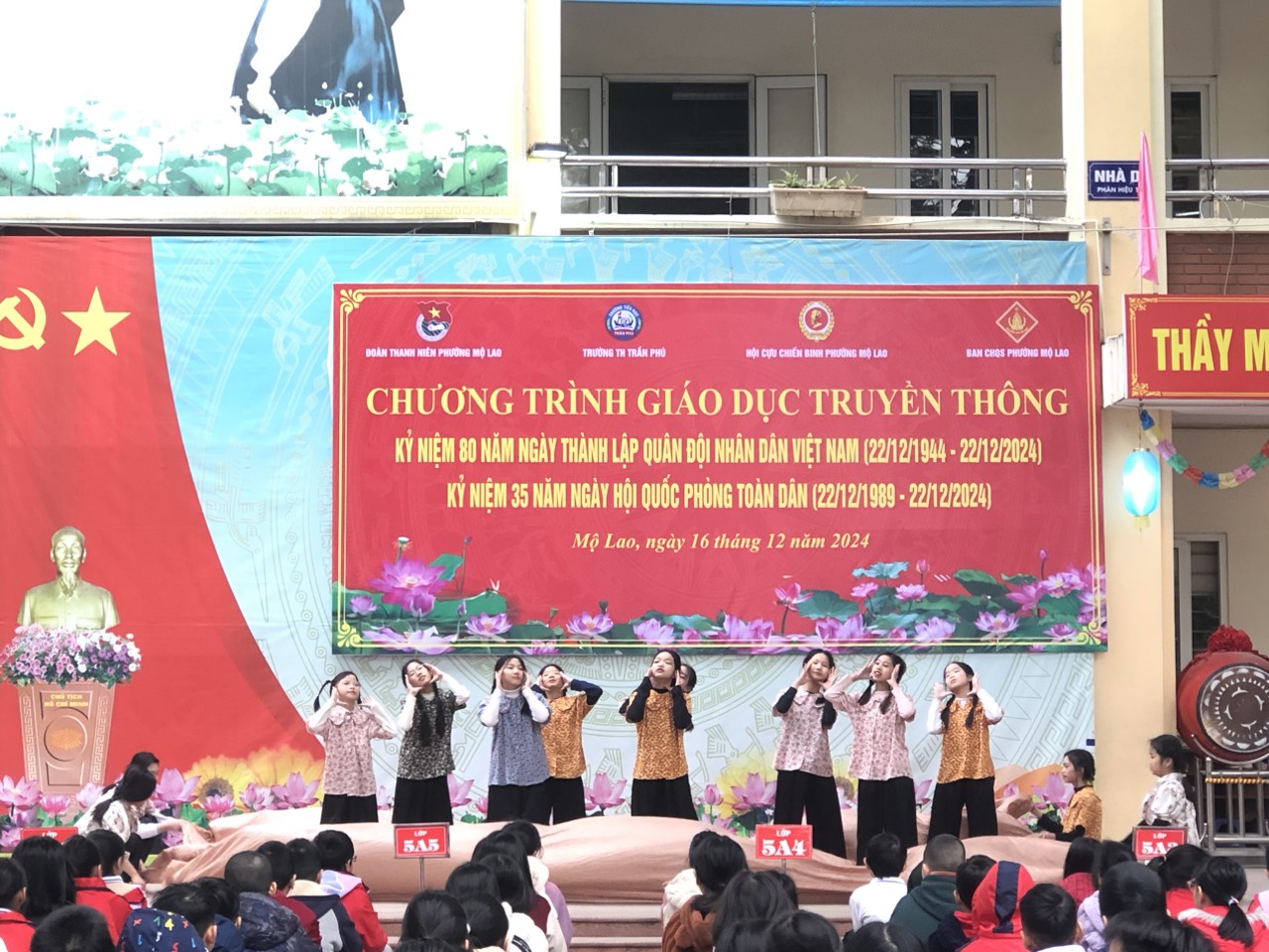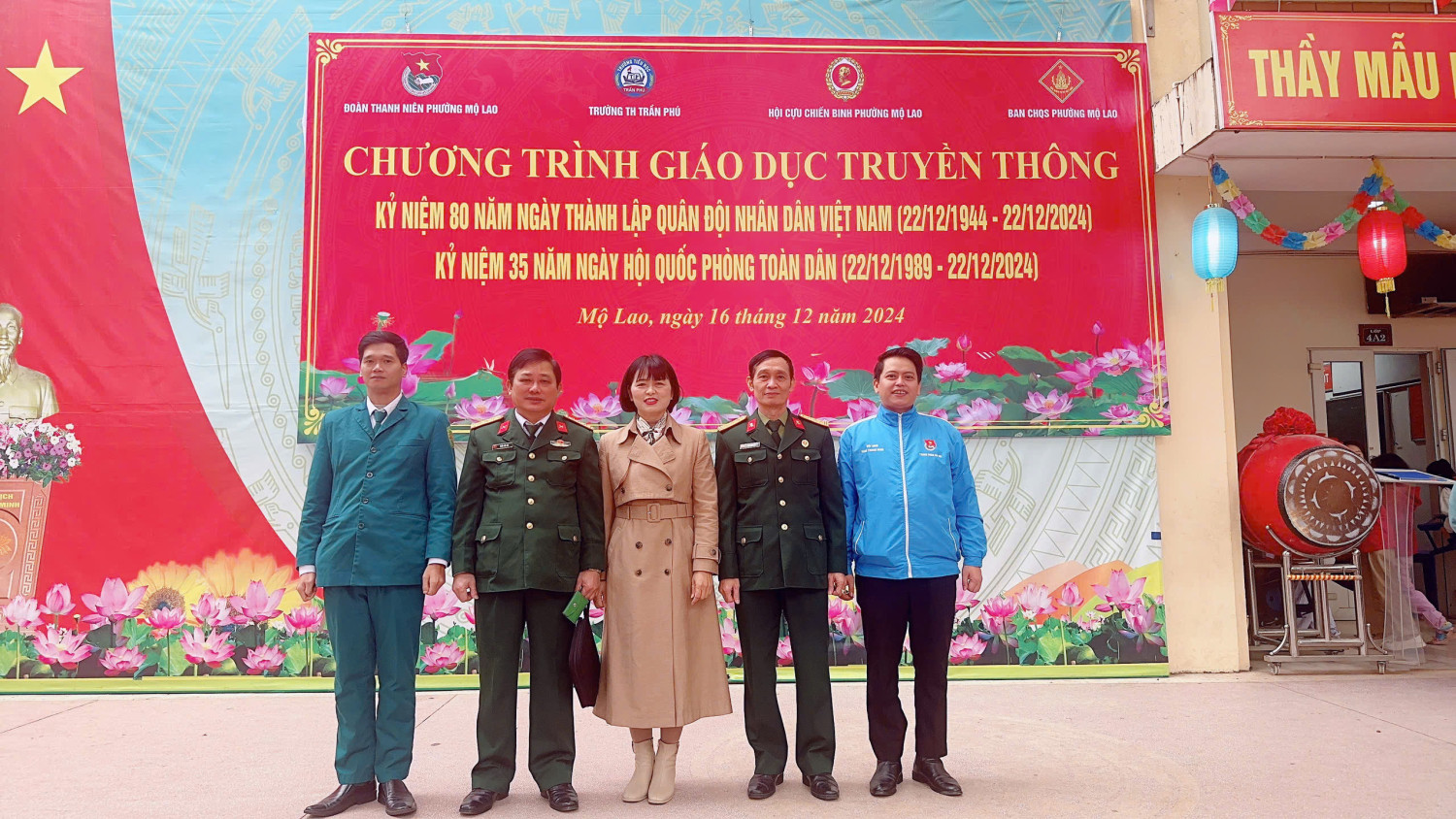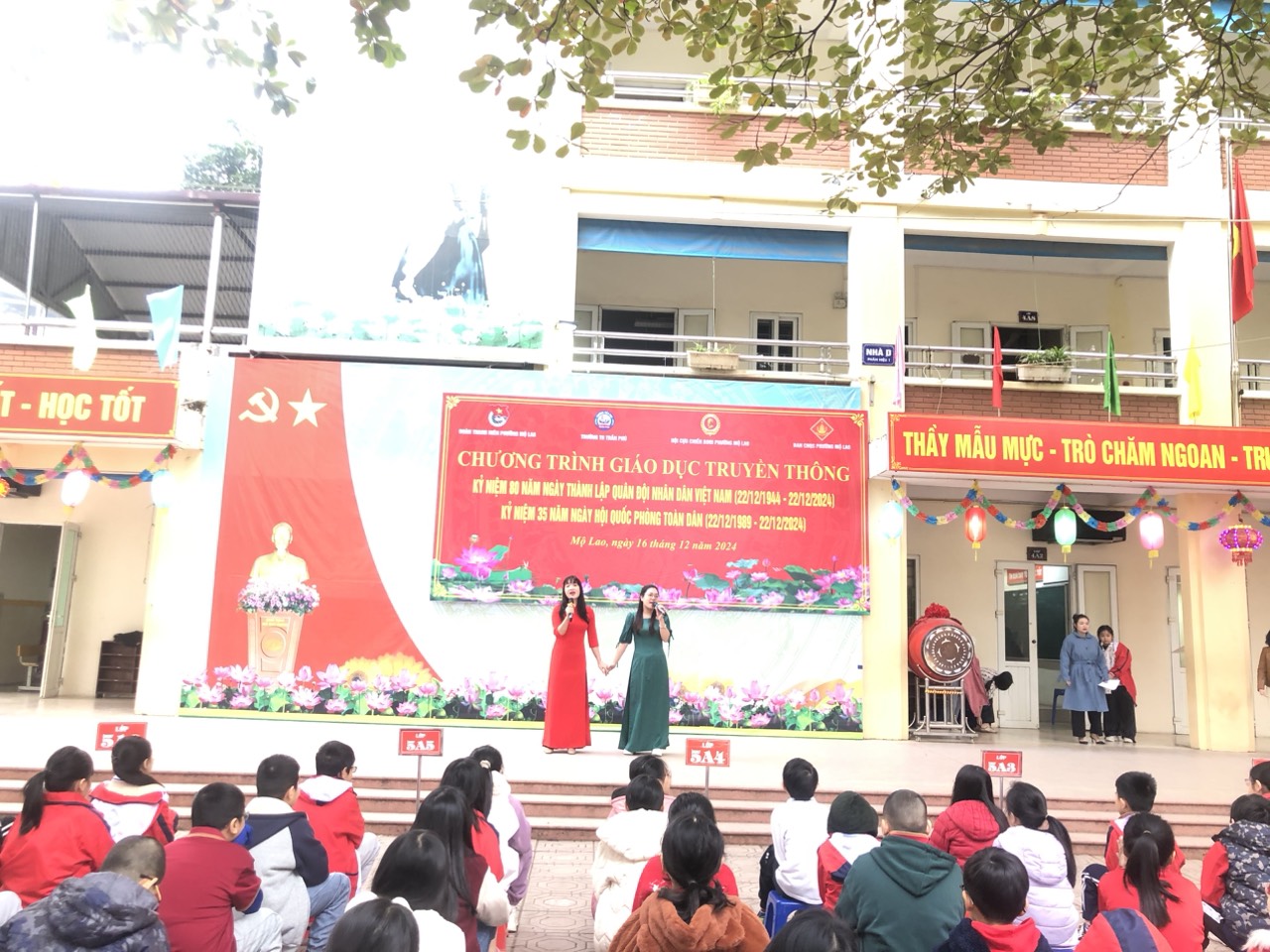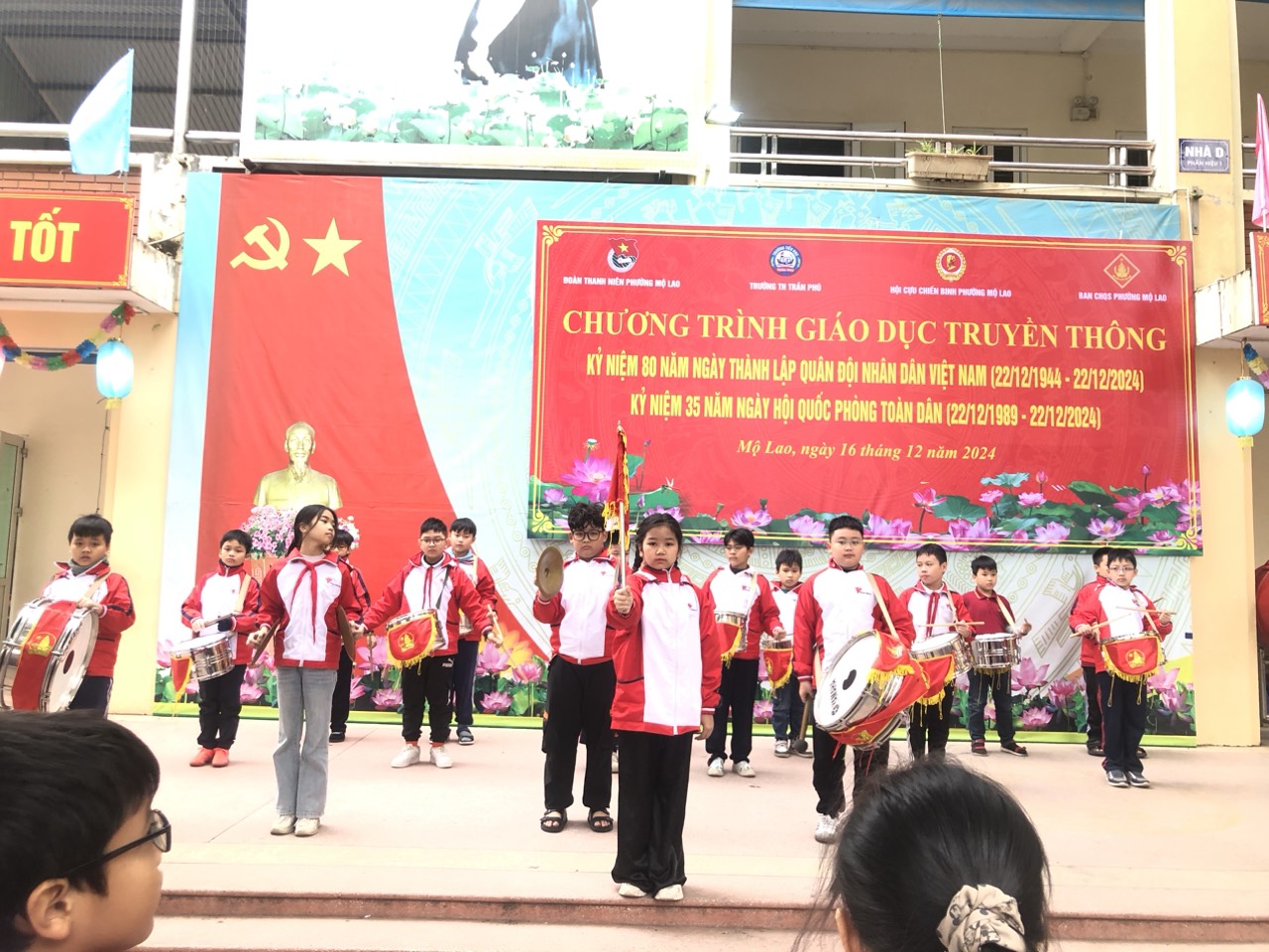 Tiếp theo là phát biểu của cô Hiệu trưởng, và đặc biệt bài phát biểu của Thượng tá Trần Hữu Nội - đại diện cho hội cựu chiến binh phường Mộ Lao lên ôn lại truyền thống về tinh thần chiến đấu bất khuất của Quân đội ta trong thời chiến cũng như thời bình để các em học sinh cùng học hỏi.