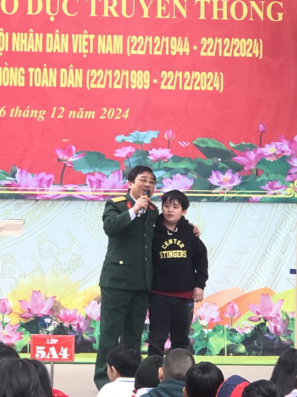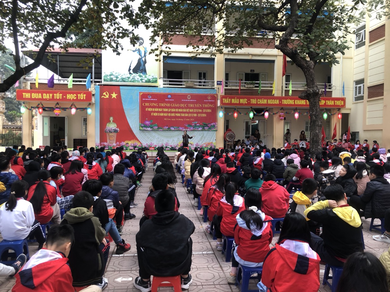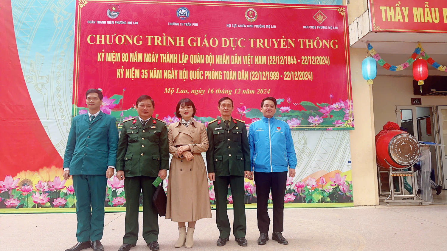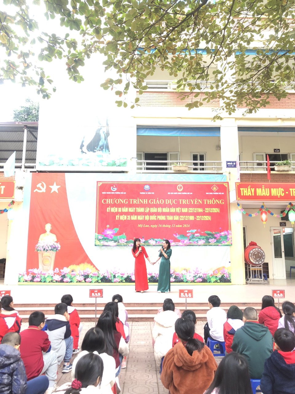 Tiếp theo là phát biểu của cô Hiệu trưởng, và đặc biệt bài phát biểu của Thượng tá Trần Hữu Nội - đại diện cho hội cựu chiến binh phường Mộ Lao lên ôn lại truyền thống về tinh thần chiến đấu bất khuất của Quân đội ta trong thời chiến cũng như thời bình để các em học sinh cùng học hỏi.