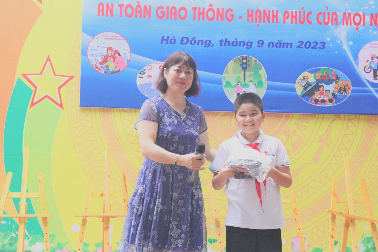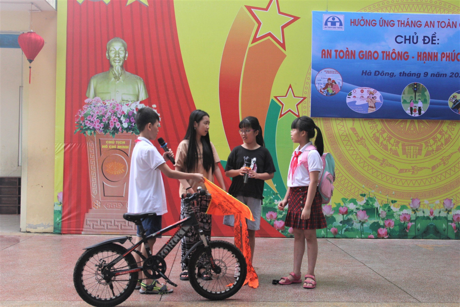 Trong cuộc vận động tháng Hưởng ứng An toàn giao thông nhà trường đã có nhiều câu hỏi đối với học sinh và sau mỗi câu trả lời đúng là một phần quà làm tăng thêm hiểu biết về luật giao thông cho các em học sinh. Dưới đây là hình ảnh của buổi lễ: