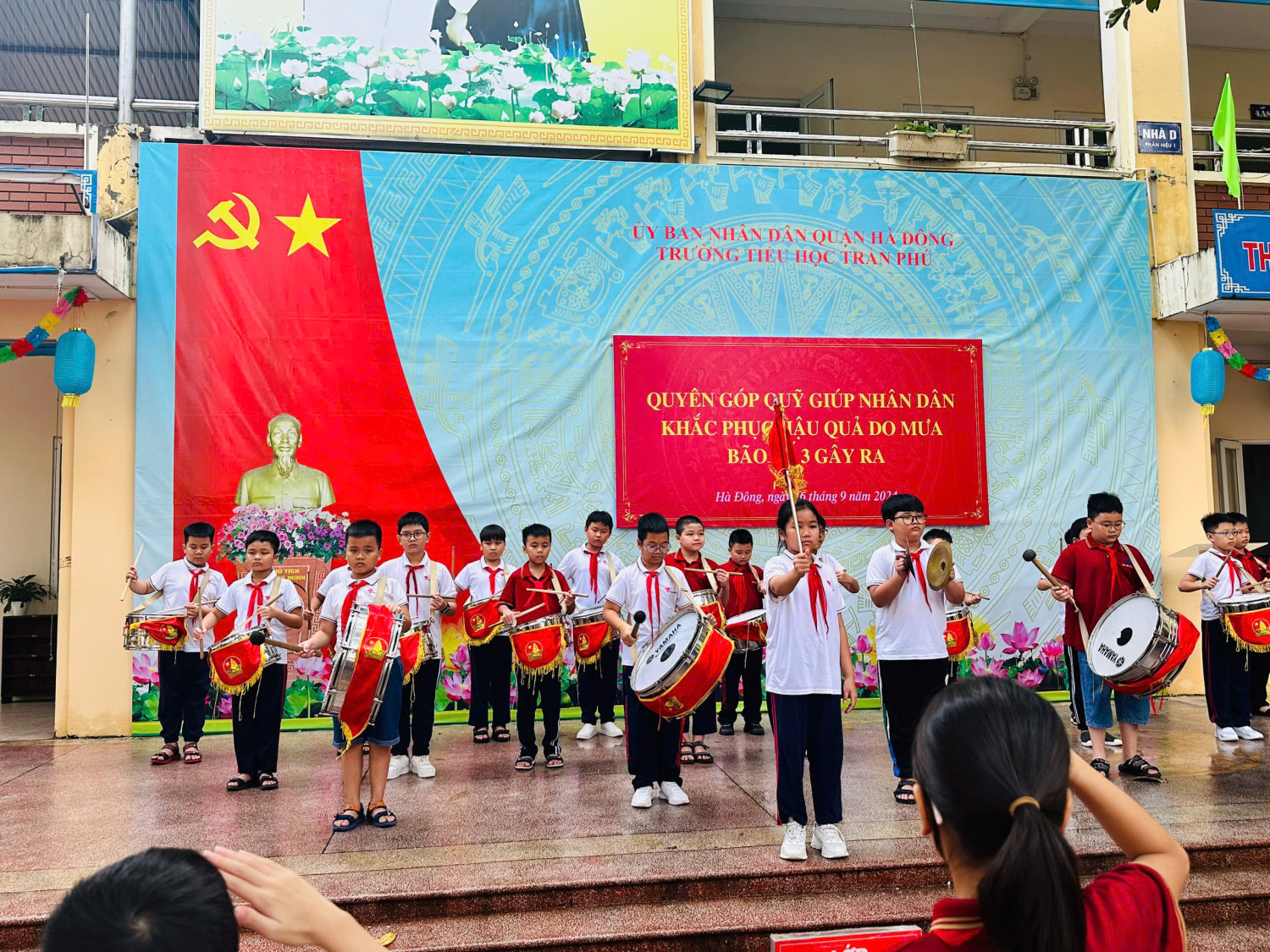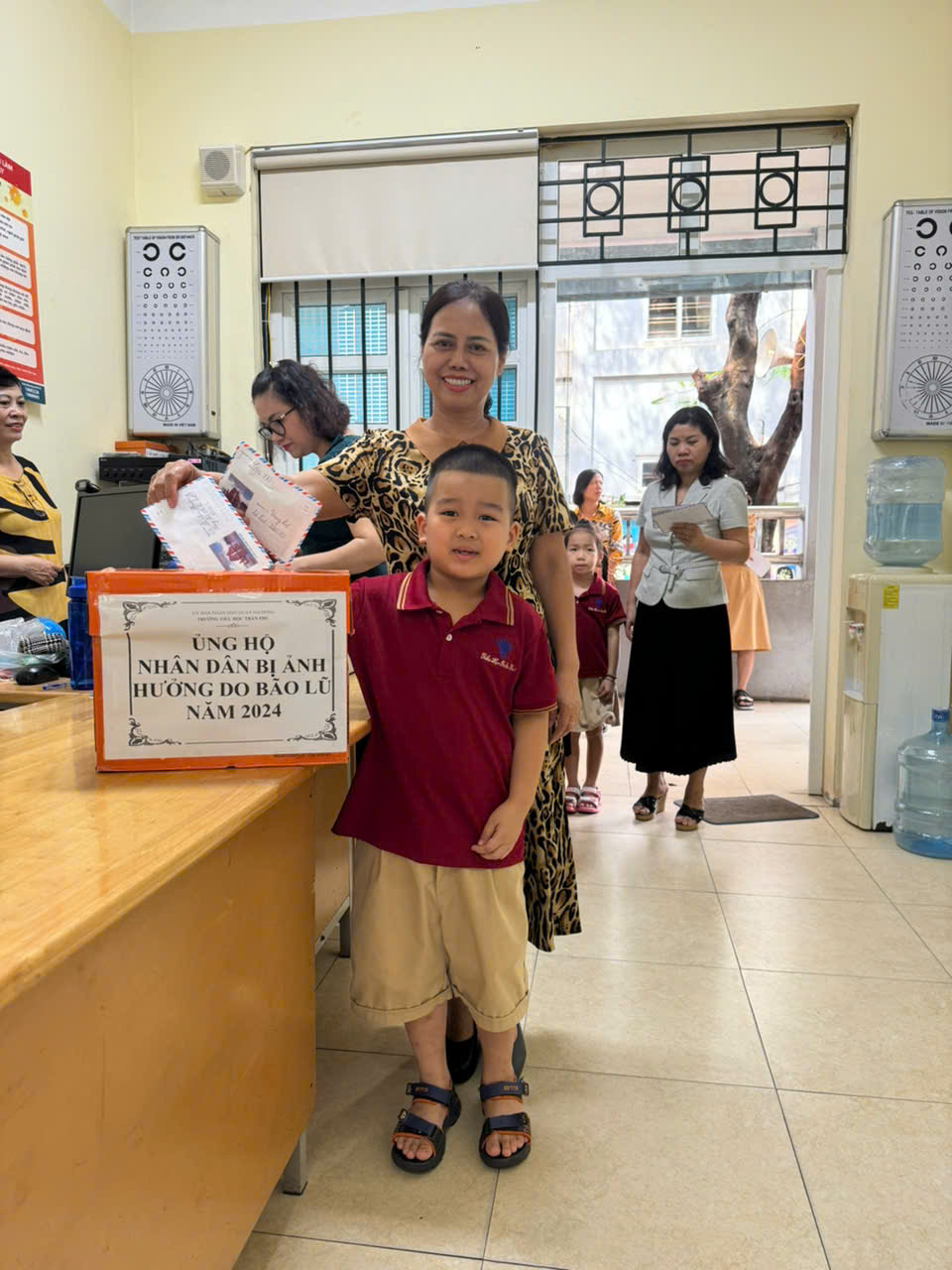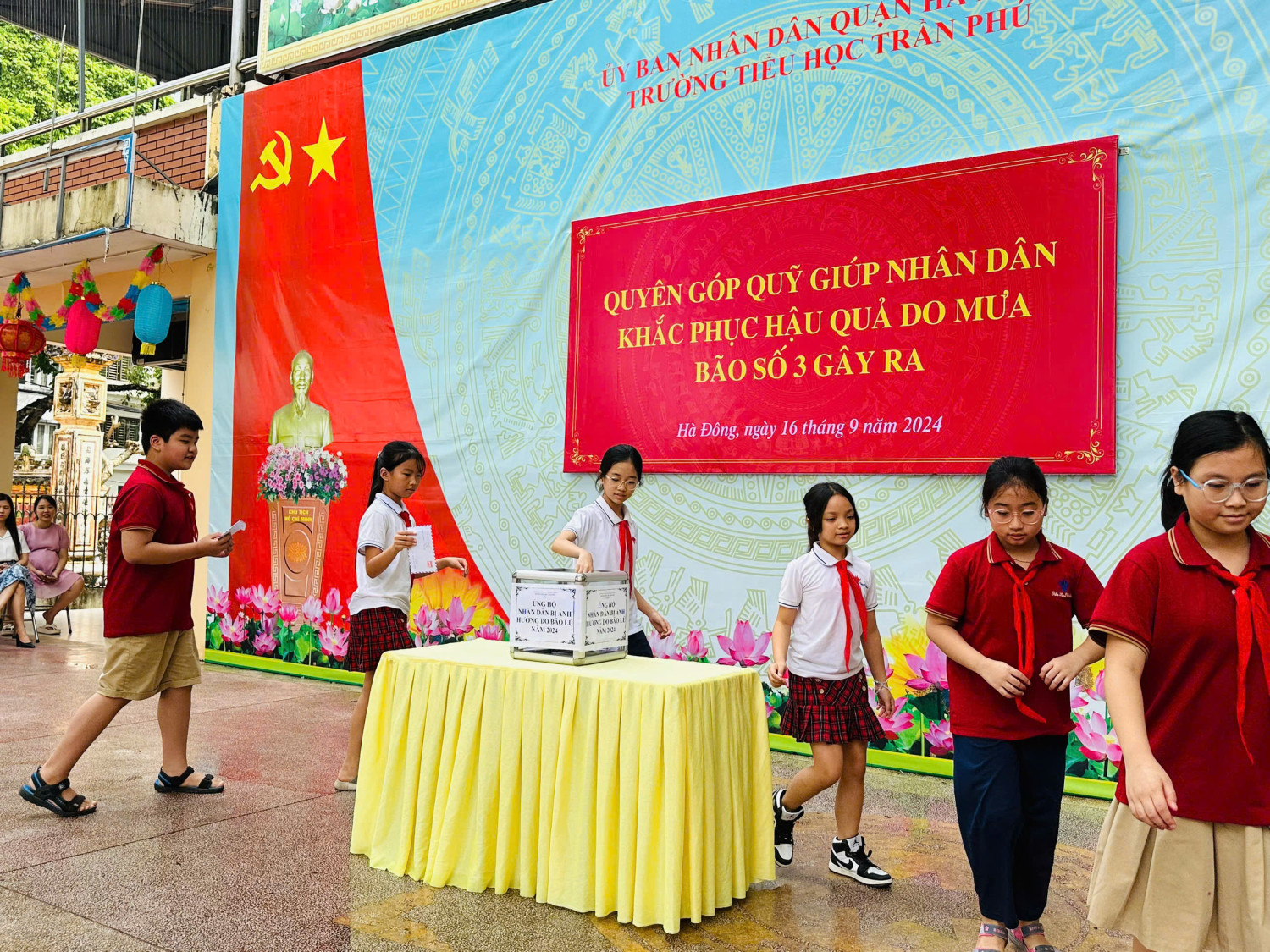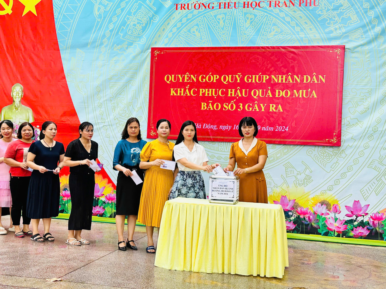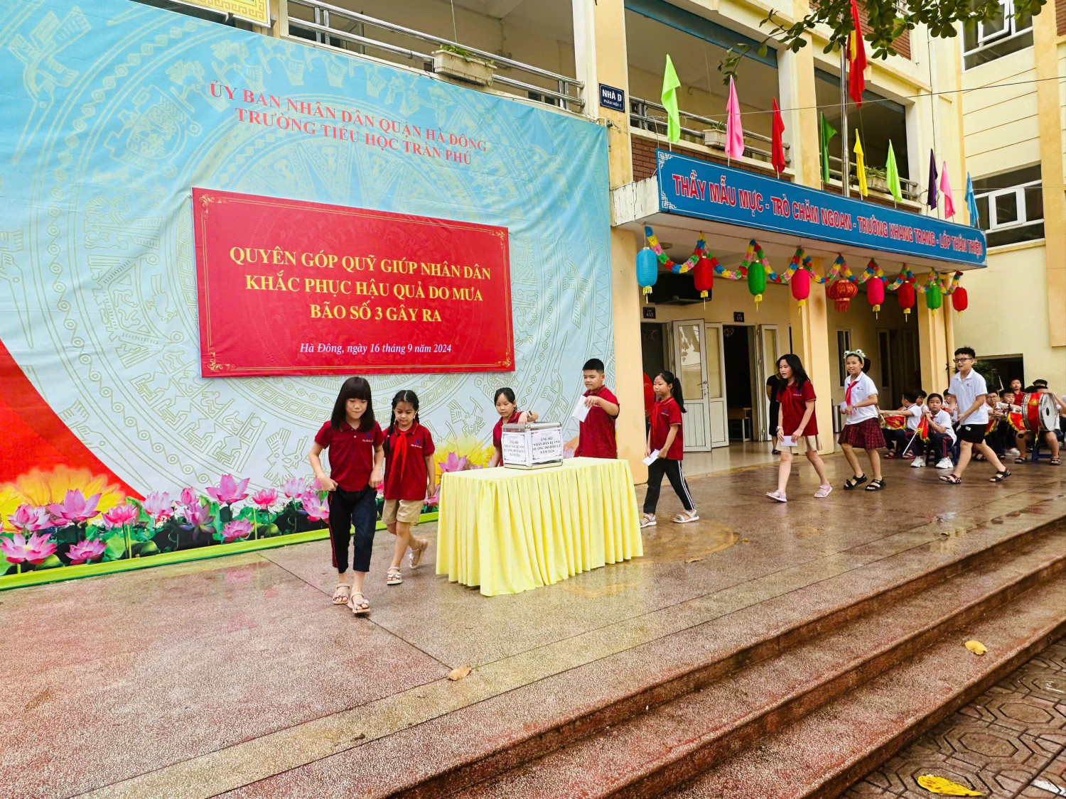 Với tinh thần trách nhiệm, tấm lòng nhân ái: “Lá lành đùm lá rách, thương người như thể thương thân, nhường cơm sẻ áo, ….” Trường tiểu học Trần Phú – Q. Hà Đông cùng đồng bào cả nước hướng về nhân dân các tỉnh miền Bắc. Mỗi đ/c CB, GV, NV ủng hộ ít nhất một ngày lương. Mỗi em học sinh ủng hộ tối thiểu 10.000 đồng để sẻ chia, giúp đỡ đồng bào khắc phục hậu quả do mưa lũ gây ra, góp phần cùng với Đảng, Nhà nước nhanh chóng khôi phục sản xuất và ổn định đời sống của nhân dân; giúp các bạn học sinh của chúng ta mau chóng được trở lại trường học.