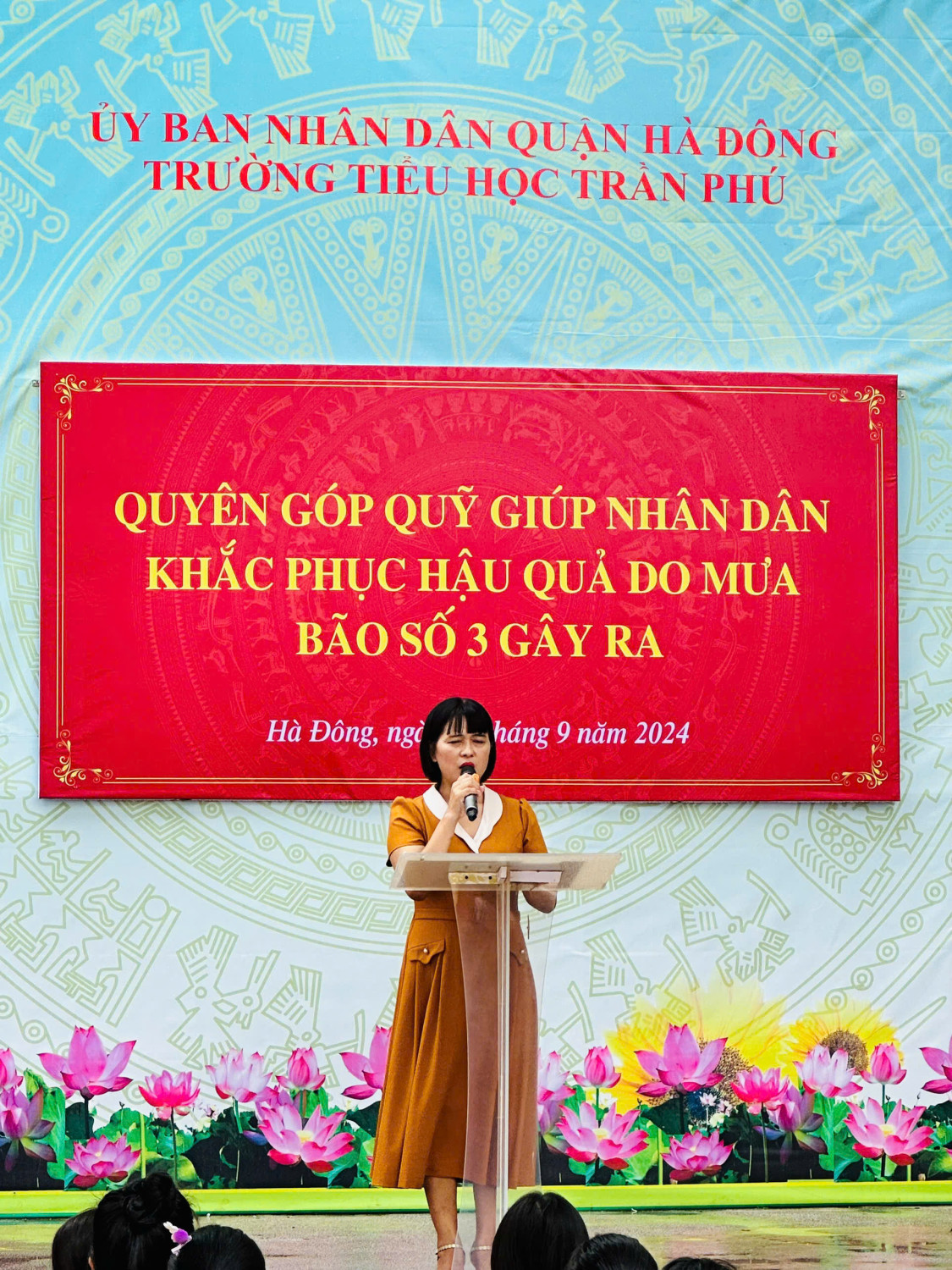 Đồng chí Hiệu trưởng thay mặt Chi ủy, BGH và BCH Công đoàn phát động phong trào “Ủng hộ đồng bào bị thiệt hại do bão số 3 gây ra” và xin thay mặt bà con vùng bị ảnh hưởng do thiên tai; cảm ơn sự chia sẻ, giúp đỡ của các thầy/cô và các em học sinh trường Tiểu học Trần Phú.