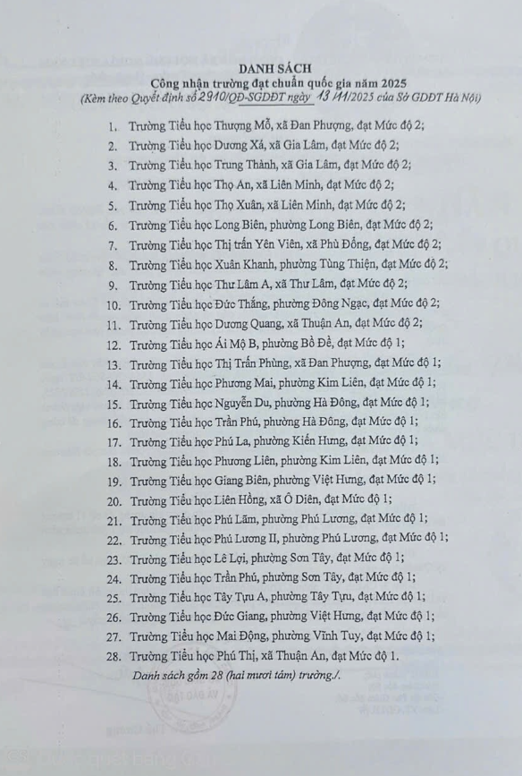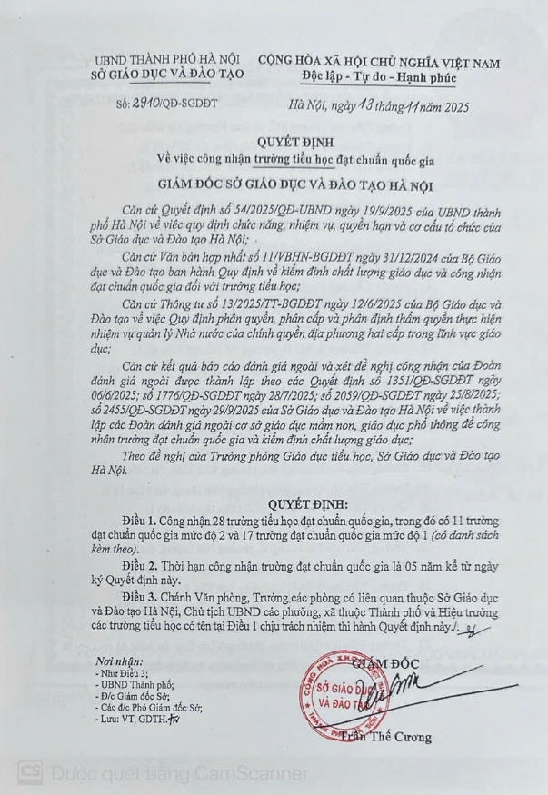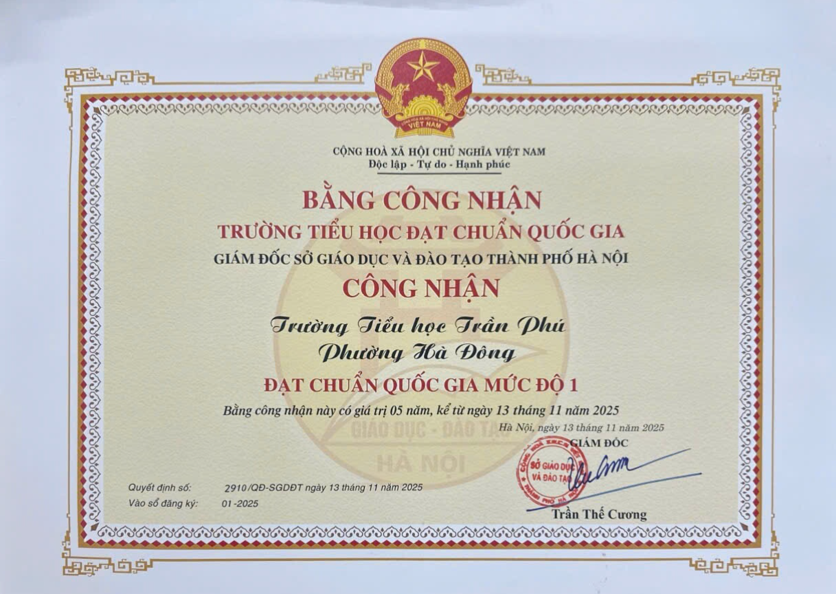 Trường Tiểu học Trần Phú vinh dự được Giám đốc Sở Giáo dục và Đào tạo thành phố Hà Nội ký ban hành Quyết định số 2910/QĐ-SGDĐT ngày 13/11/2025, công nhận Trường Tiểu học đạt chuẩn quốc gia mức độ 1.