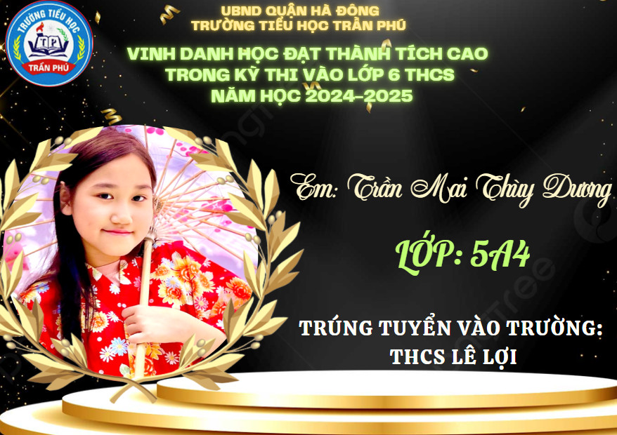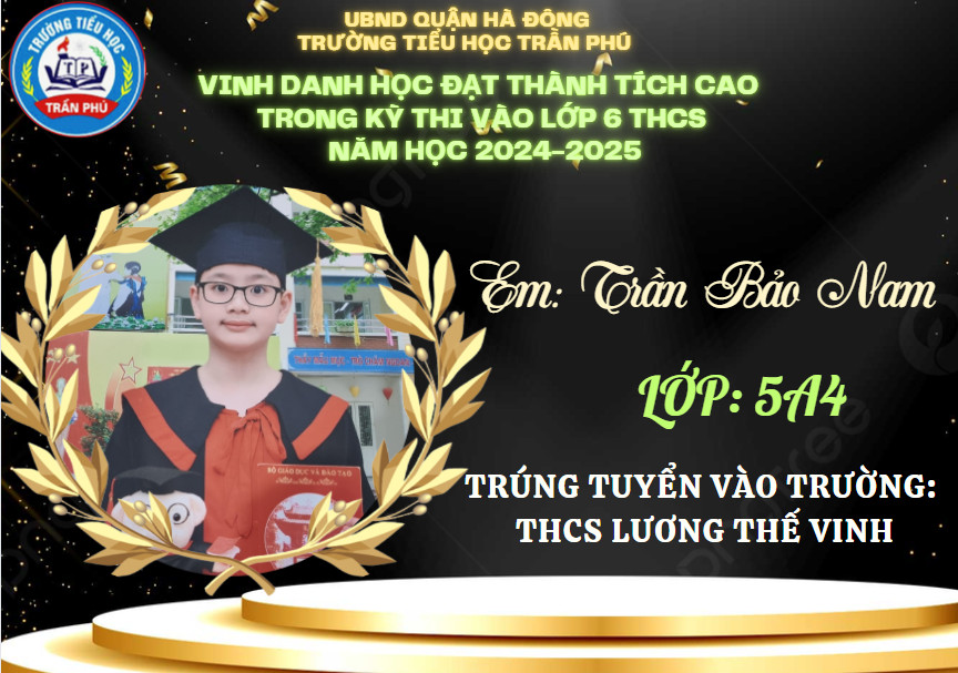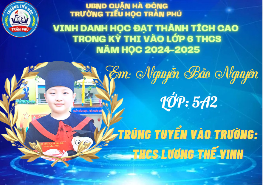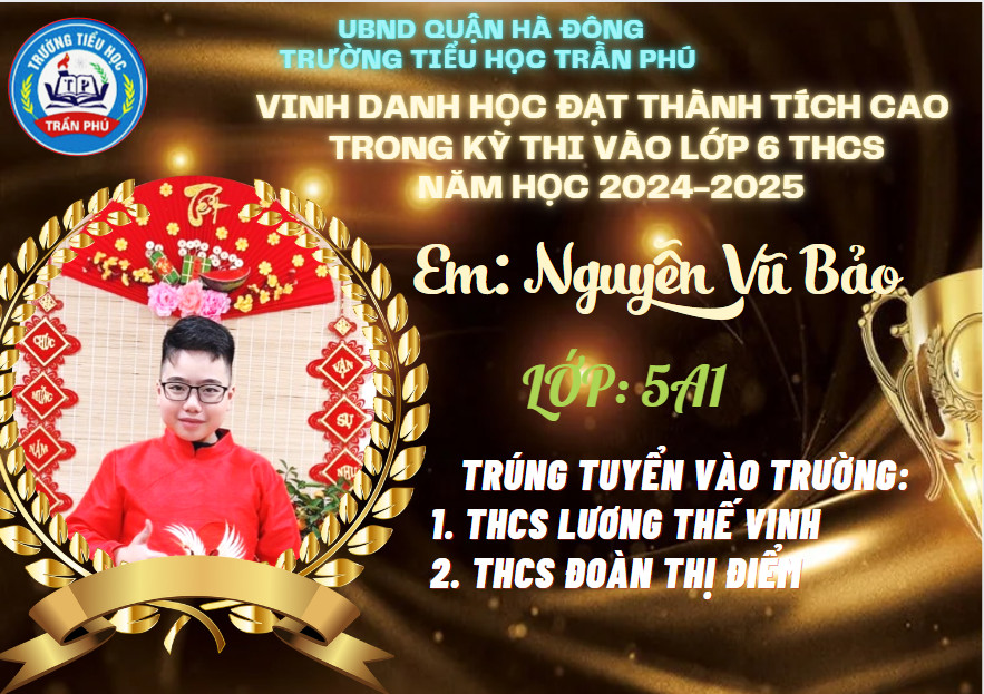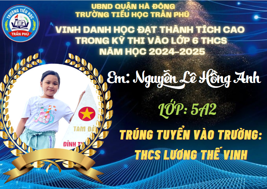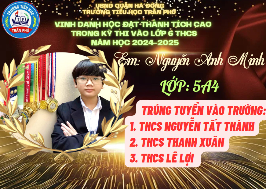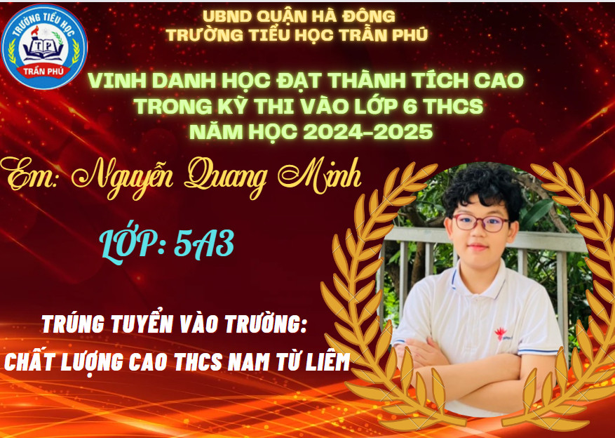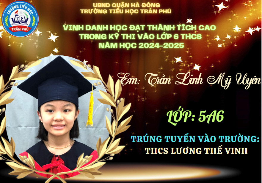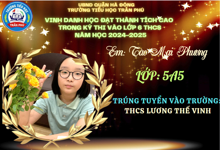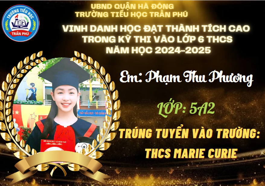 Tháng 6 rực rỡ không chỉ bởi màu đỏ của hoa phượng, bởi màu tím của hoa bằng lăng, bởi cái nắng chói chang của mùa hạ, mà nó còn đẹp rạng ngời hơn bởi tin chiến thắng từ các em học sinh lớp 5 gửi về cho thầy cô và nhà trường. Có nhiều con đã đỗ vào các trường chất lượng cao, trường chuyên. Thầy cô tự hào về các con - những học sinh đã góp phần tạo nên truyền thống vẻ vang của trường Tiểu học Trần Phú – Q. Hà Đông.