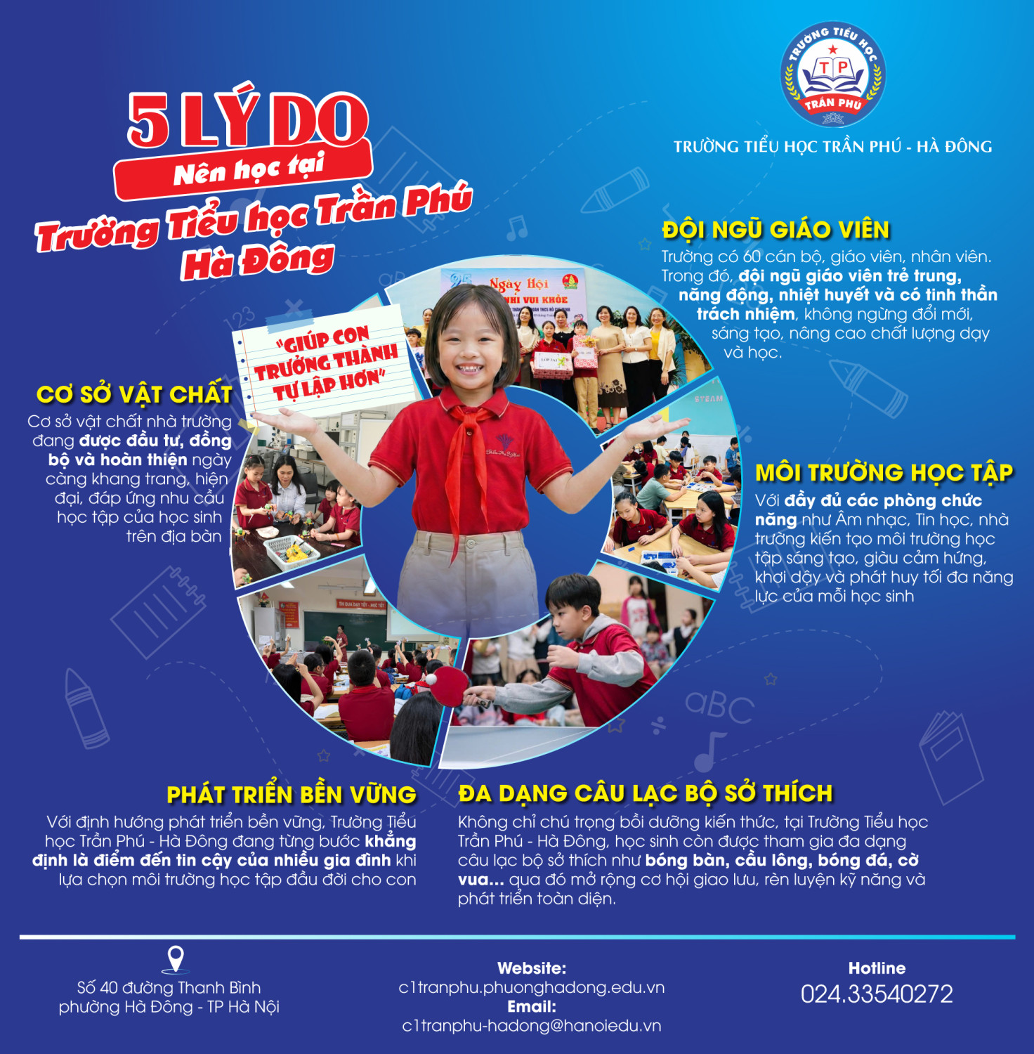 * Với môi trường học tập hiện đại, đội ngũ giáo viên tận tâm, giàu kinh nghiệm cùng chương trình giáo dục toàn diện, Trường Tiểu học Trần Phú - Hà Đông hân hạnh chào đón các em học sinh thân yêu gia nhập ngôi nhà chung thân thiện, an toàn và giàu cảm hứng học tập.