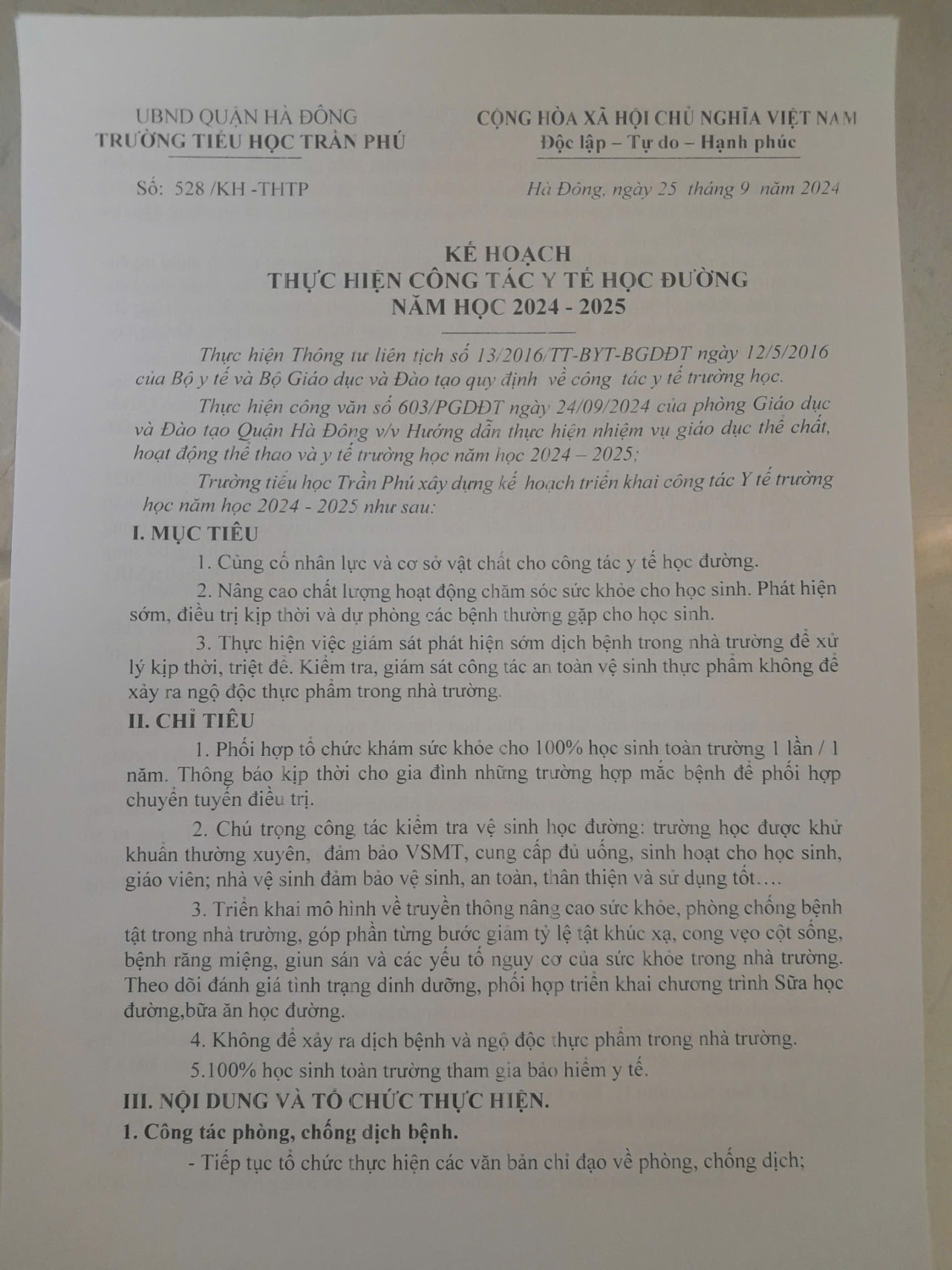 Kế hoạch thực hiện công tác y tế học đường
